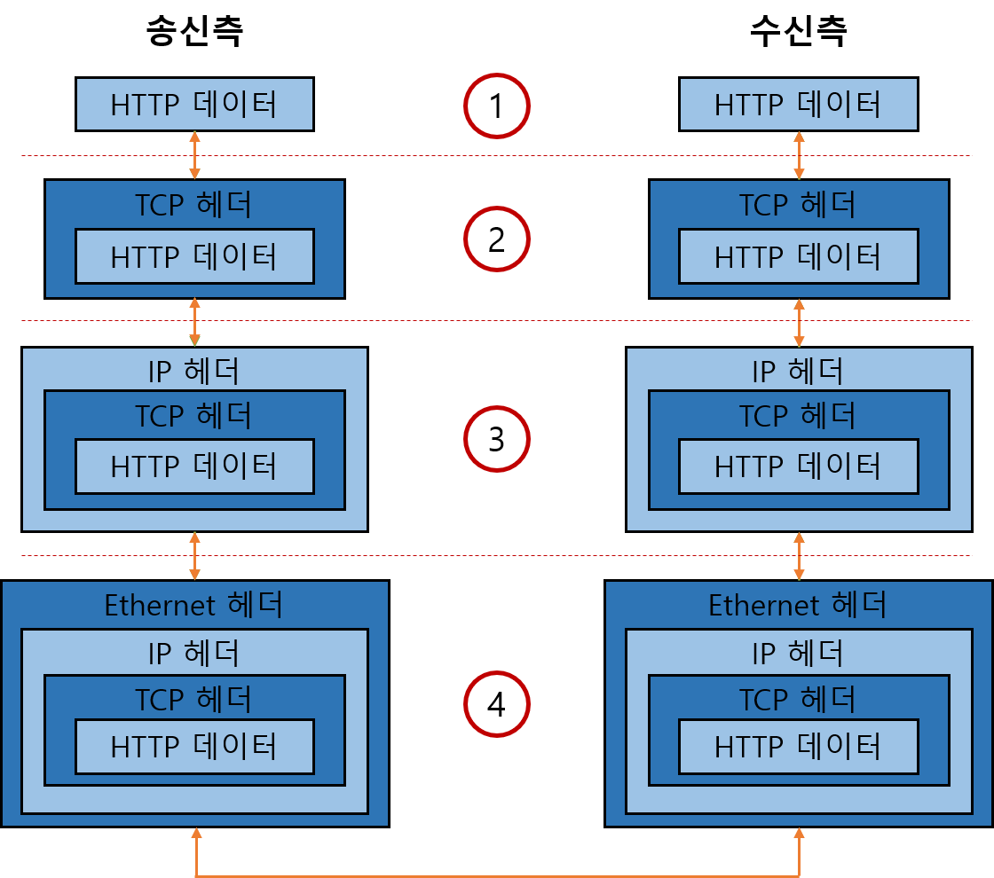 - TCP/IP 통신을 할 때 계층을 순서대로 거쳐 상대와 통신.