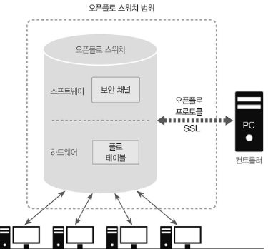 • 일반적인 하드웨어 기반의 네트워크 장비(라우터, 스위치)는 플로 테이블(Flow Table)을 이용해서 네트워크 트래픽을 처리하는 반면에, 오픈플로는 소프트웨어 컨트롤러로 플로 테이블을 조작하고 데이터 경로를 설정해서 사용자, 애플리케이션, 세션 계층 수준에서 실시간 변화에 대응할 수 있다.