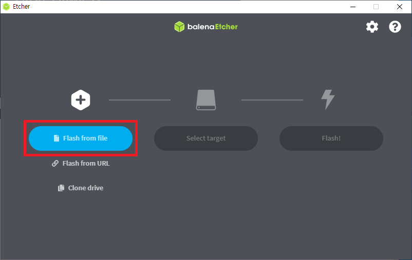 Balena Etcher 다운로드 및 실행후 Flash from file 버튼을 선택하여 다운로드 받은 OS 이미지를 선택합니다.