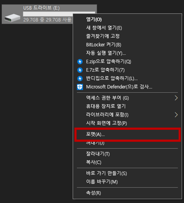 • [USB 드라이브] 오른쪽 마우스 클릭 - (필자는 SD 리더기를 사용하였습니다.) / 왼쪽 그림 참조