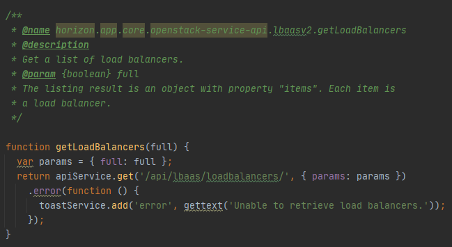 [그림 20] API 호출에 대한 파일 - lbaasv2.service.js- 그림 19에서 초록색으로 밑줄친 부분이 CRUD를 정의한 부분입니다. 예시는 List 호출에 대한 그림만 참조하며, 그림은 아래와 같습니다!