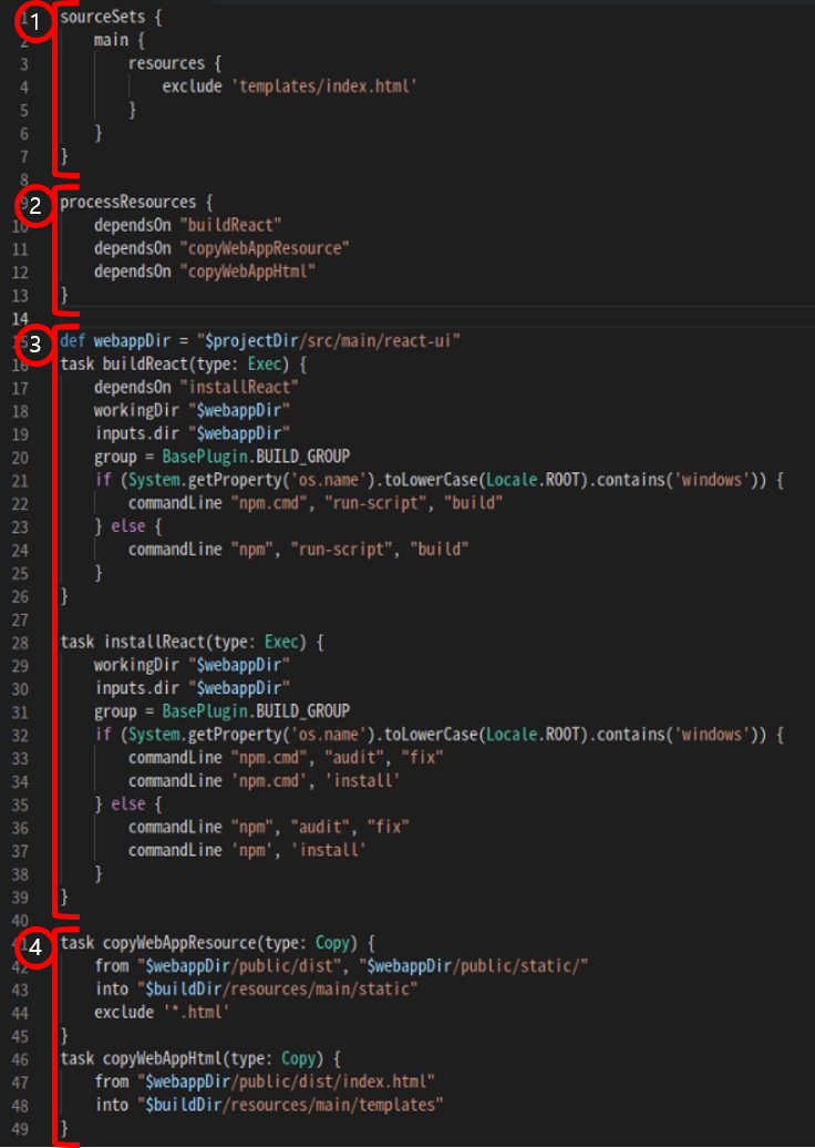 - 빌드에서 제외할 파일 및 복사할 파일을 지정할 수 있지만, 필자는 Thymeleaf에 작성한 Index.html을 사용하지 않고 React에서 빌드한 index.html을 사용하여 작업하려고 해당 부분을 제외하였습니다.