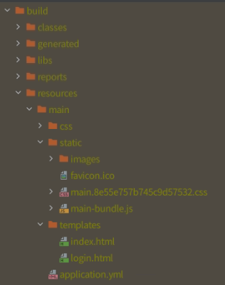 [그림 6]를 보시면 static 내부에는 [그림 4]의 4번에 작성된 React 빌드 파일들이 원하는 위치에 파일이 복사된 것을 확인할 수 있습니다! 추가로 Thymeleaf는 [그림 6]의 build - resources - main - templates 폴더 밑에 login.html이 잘 들어간 것을 확인할 수 있습니다!
