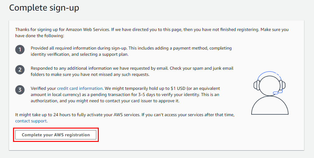 1) Complete your AWS registration 클릭
