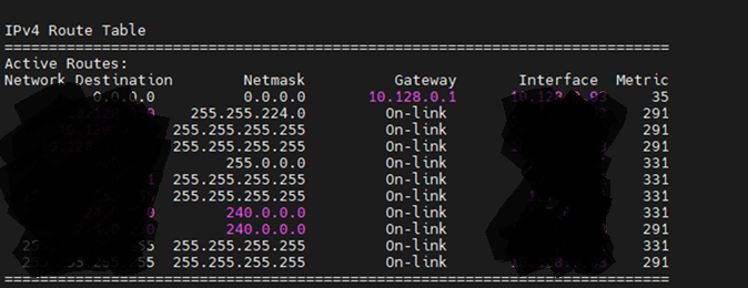아래 표에는 Gateway(목적지 다음 경유지), Metric(우선순위), Interface(실제로 나가는 장치) 등이 기록되어 있는 것을 확인할 수 있다.